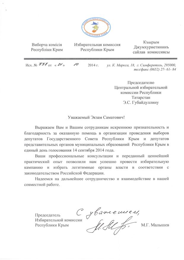 В ЦИК РТ поступила благодарность Избирательной комиссии Республики Крым